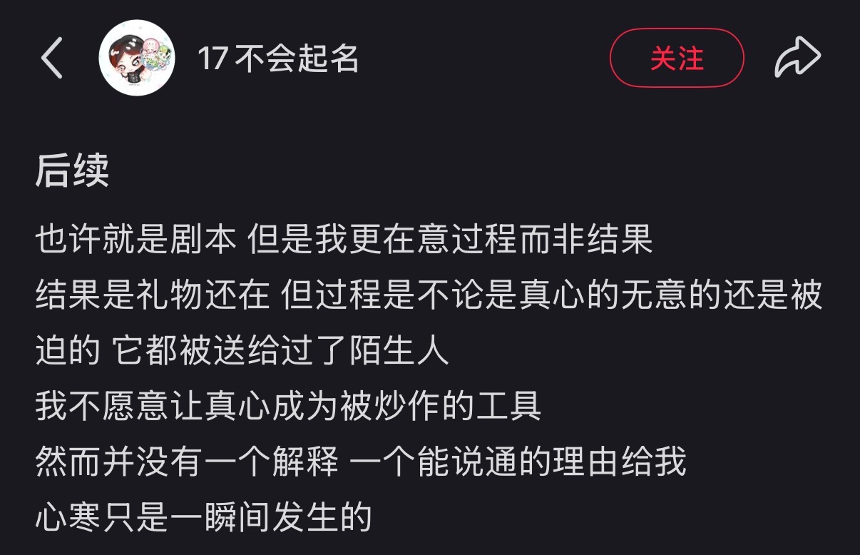 9月10日晚,“17不会起名”发文回应了此事后续:“也许就是剧本,但是我更在意过程而非结果。结果是礼物还在,但过程是不论是真心的无意的还是被迫的,它都被送给过了陌生人,我不愿意让真心成为被炒作的工具。”