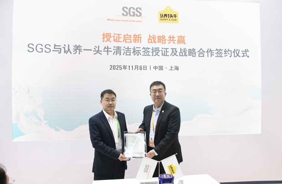 2025年11月6日,在第八届中国国际进口博览会现场,国际公认的测试、检验和认证机构SGS向乳业品牌认养一头牛颁发冰淇淋品类“清洁标签”证书,这是国内冰淇淋领域发出的首张该类别证书。同期丰益国际,双方签署战略合作协议,标志着以品质为核心的深度协同迈入全新阶段,为乳制品行业高质量发展树立典范。